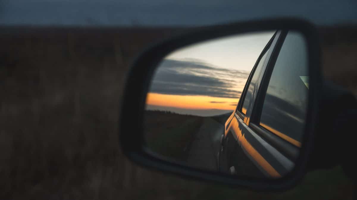 A reflection of the beautiful sunset through the car's wing mirror